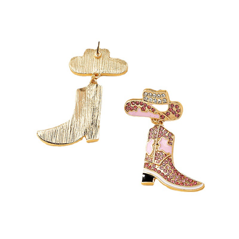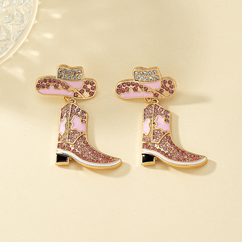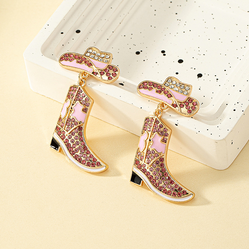 欧美时尚西部牛仔女郎滴油镶钻靴子耳环夸张气质彩钻牛仔帽女耳坠 粉红色