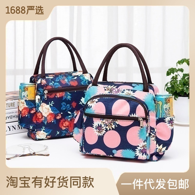 手提包女小布包包加厚女士便当饭盒袋中年妈妈拎袋上班斜挎带饭包 深蓝红点